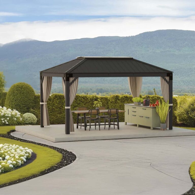 Enhance your outdoor gatherings by adding an optional bar, creating a stylish backyard party hub. Customize your structure with adjustable louver panels, screen drapes, privacy drapes, and base panel metal walls to suit your preferences.